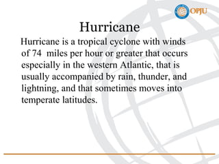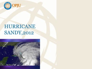 Hurricane Sandy was a devastating hurricane that hit the East Coast of the United States in 2012. It caused over $69 billion in damage, making it the second costliest hurricane on record at the time. Hurricane Sandy had maximum sustained winds of 155 mph and dropped over 300 trillion gallons of rain as it moved inland. The storm caused widespread destruction along the East Coast from the Caribbean to Canada, killing at least 233 people. New York City and New Jersey experienced the worst impacts, including severe flooding and power outages. Hurricane Sandy highlighted the vulnerability of coastal infrastructure to major storms.