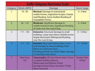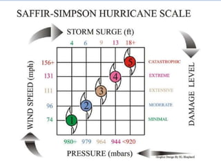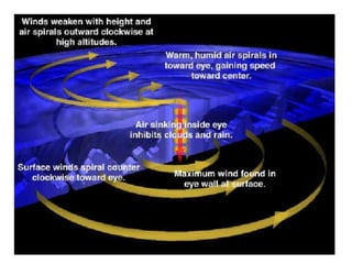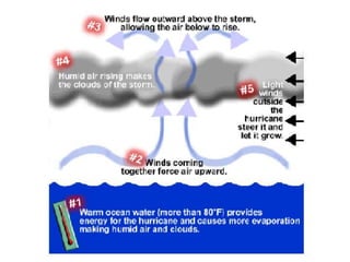 Hurricanes form over warm ocean waters between 15 and 200 latitude from the equator when low pressure systems allow warm, humid air to rise and condense. They have a circular structure with counterclockwise spinning winds in the Northern Hemisphere that can be hundreds of miles wide. Hurricanes strengthen over warm ocean waters but weaken when making landfall or interacting with strong upper level winds or cooler waters. They can cause extensive wind damage, flooding from heavy rains, and storm surges that become especially destructive during high tides.