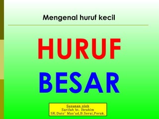 Dokumen ini membahas pengenalan huruf besar dan kecil, disusun oleh Sarifah bt. Ibrahim. Terdapat penjelasan yang berurutan mengenai setiap huruf dalam alfabet dari A hingga Z. Fokus utama adalah pada pengenalan huruf kapital.