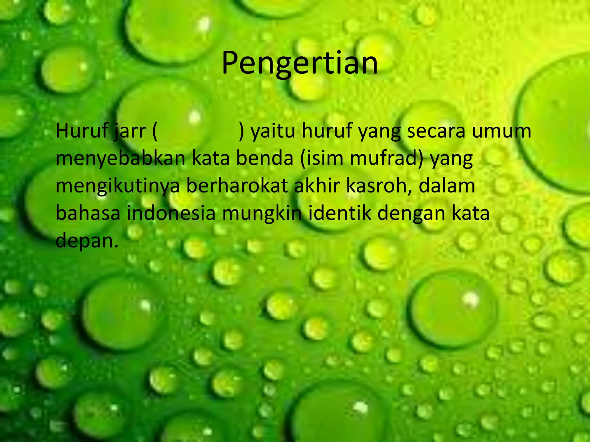 Dokumen ini menjelaskan pengertian huruf jar dalam bahasa Arab, yang berfungsi seperti kata depan dan mempengaruhi harakat akhir kata benda yang mengikutinya. Berbagai contoh penggunaan huruf jar seperti 'fii', 'min', 'ilaa', dan lainnya diberikan untuk memperjelas fungsi dan artinya. Terdapat juga penjelasan mengenai penyusunan huruf jar dengan kata benda, serta contoh untuk isim mutsanna dan jamak mudzakkar salim.