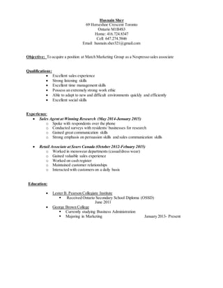 Husnain Sher is applying for a position as a Nespresso sales associate at Match Marketing Group. He has excellent sales experience from previous roles as a Sales Agent conducting surveys and as a Retail Associate at Sears Canada. Sher has strong communication, listening, time management, and social skills along with a strong work ethic and ability to adapt quickly as shown through his education and work history.