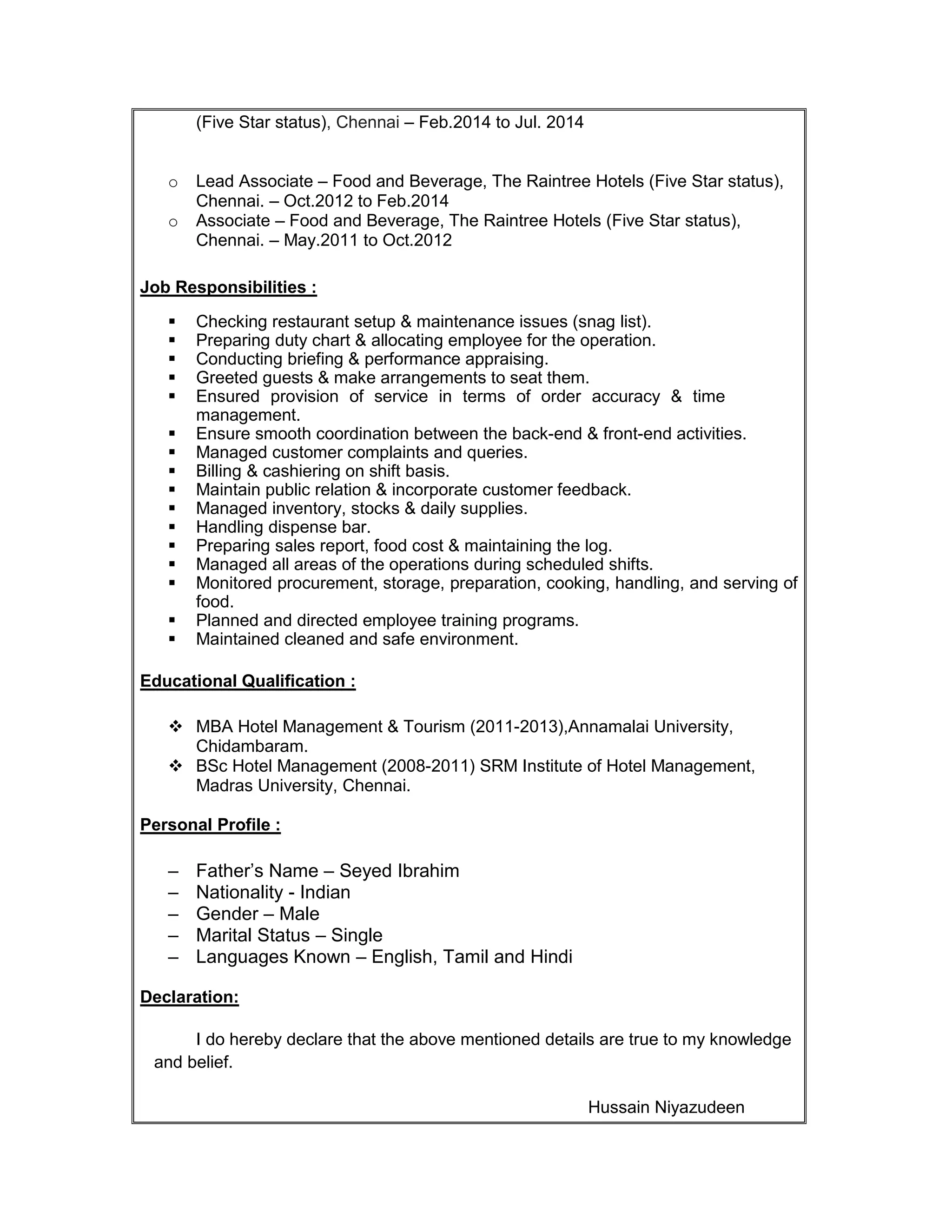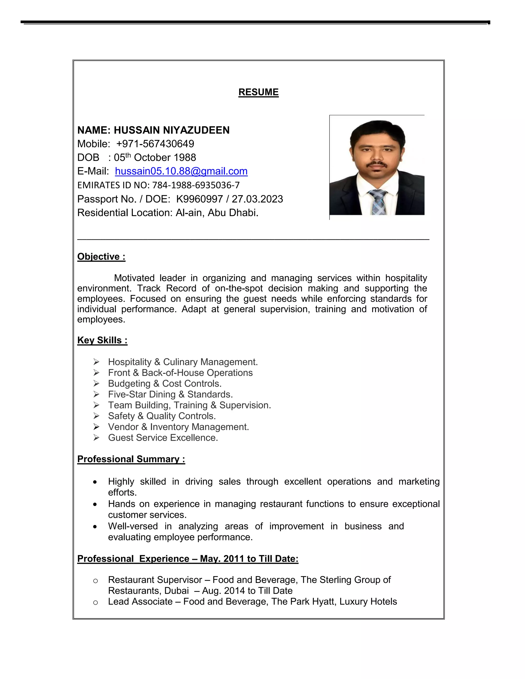 Hussain Niyazudeen is a hospitality professional based in Al-ain, Abu Dhabi seeking a leadership role managing services. He has over 10 years of experience in food and beverage operations at luxury hotels in Dubai and India, including managing restaurant functions and evaluating employee performance to ensure exceptional customer service. Hussain holds an MBA in Hotel Management and a BSc in Hotel Management, and has skills in budgeting, team building, and quality controls.