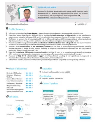 Husain Mahdi is an HR professional with over 14 years of experience in human resource management and administration, specializing in strategic HR planning, employee relations, and performance appraisal. He has received multiple awards for his contributions, including the Star Leadership Award and Outstanding Contribution Award, and is familiar with Oman labor laws and ERP systems. His expertise includes implementing HR strategies, managing recruitment processes, payroll operations, and maintaining regulatory compliance while fostering a positive workplace environment.