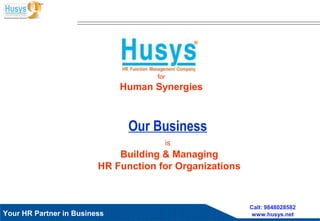 Husys Consulting Pvt Ltd is an HR consulting firm that provides various HR services to organizations. Its services include HR function outsourcing, strategic consulting, business incubation, executive search, and competency enhancement. It aims to synergize human potential for business and society. Husys differentiates itself by integrating HR strategy with business goals, providing a one-stop solution for HR needs, and using technology to improve efficiency and decision making. It works with clients across various industries to build and manage their HR functions.
