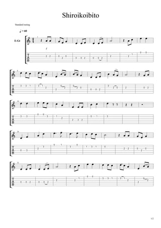 This document contains a musical score titled "Shiroikoibito" in standard tuning for the electric guitar. It consists of 60 measures of music notation written in a numeric format, with numbers representing notes to be played on the guitar strings at each measure.