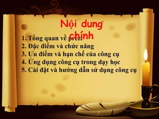 Prezi là ứng dụng tạo bài thuyết trình trực tuyến hoặc offline, nổi bật với việc cho phép người dùng zoom để nhấn mạnh nội dung. Tài liệu cung cấp tổng quan về Prezi, bao gồm đặc điểm, chức năng, ưu điểm và nhược điểm, cũng như hướng dẫn cài đặt và sử dụng cho người dùng. Dù có nhiều tiện ích, Prezi cũng hạn chế khả năng tùy biến và gặp khó khăn khi làm việc với văn bản bằng tiếng Việt.