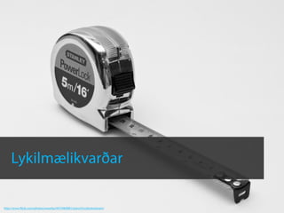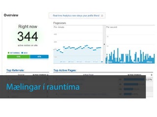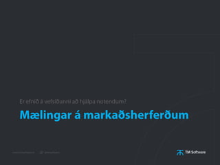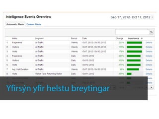 Fyrirlestur haldinn á Töff Stöff! Veflausnadegi TM Software 18. október 2012. http://www.tmsoftware.is/tm-software/vidburdir/vidburdur/item68106/Toff-Stoff--Veflausnadagur-TM-Software/ Fjölmargar íslenskar vefsíður nýta Google Analytics til mælinga á fjölda heimsókna, gesta og innlita og í þessum fyrirlestri mun Soffía Þórðardóttir, hópstjóri vefráðgjafar hjá TM Software, sýna hvernig nýta má Google Analytics á þann hátt að hægt sé að taka raunverulegar ákvarðanir um breytingar á vefsíðunni út frá niðurstöðum mælinga.