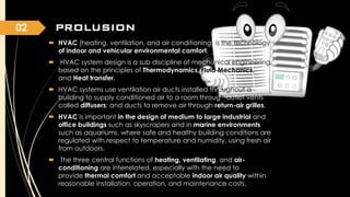 The document provides an overview of HVAC (heating, ventilation, and air conditioning) systems. It discusses key components such as furnaces, heat exchangers, evaporator coils, condensing units, ducts, vents, and thermostats. It explains how HVAC systems work to moderate interior temperatures through heating in winter and cooling in summer. Performance metrics for HVAC systems like efficiency, EER, and SEER are also defined.