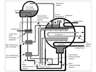This document discusses HVAC and refrigeration systems. It provides information on types of refrigerants used in centrifugal chillers and unitary AC units. It notes that R-11, R-12 and R-22 are being phased out due to being CFCs and lists phase-out dates for various refrigerants. It also discusses vapor compression systems, properties of commonly used refrigerants, and ways to improve system performance and reduce energy consumption through maintenance and optimization of operating parameters.