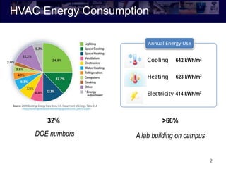- HVAC energy consumption for a lab building, with cooling and heating accounting for over 60% of annual energy use.