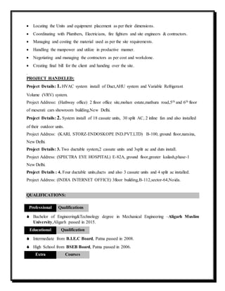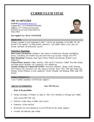 MD Auarngzeb is applying for an HVAC Engineer position, possessing expertise in heat load calculations, duct designing, and chilled water systems. He has 1 year and 7 months of experience as a site engineer at Aircon Enterprises, having handled multiple HVAC projects, including the installation of duct and VRV systems. He holds a Bachelor's degree in Mechanical Engineering from Aligarh Muslim University and has completed additional HVAC courses.