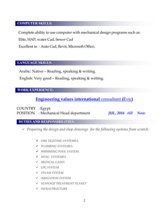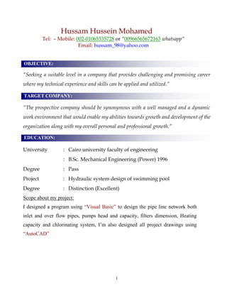 Hussam Hussein Mohamed is a mechanical engineer with extensive experience in electromechanical design and project management, particularly in plumbing, HVAC, and fire fighting systems. He holds a B.Sc. in Mechanical Engineering from Cairo University and has worked on notable projects in Egypt, Saudi Arabia, and Qatar. Hussam is proficient in various design software and seeks a challenging role in a dynamic environment to further his career.