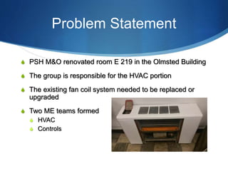 The Siemens Room Renovation project involved replacing the HVAC system in room E 219 of the Olmsted Building. An ME team analyzed the old fan coil system and considered three replacement options: a two-pipe fan coil system, variable air volume system, and chilled beam system. They determined the updated fan coil system would be the most cost effective solution. The project scope was to research systems, install and commission the new HVAC by spring 2015, and benchmark the installed system.