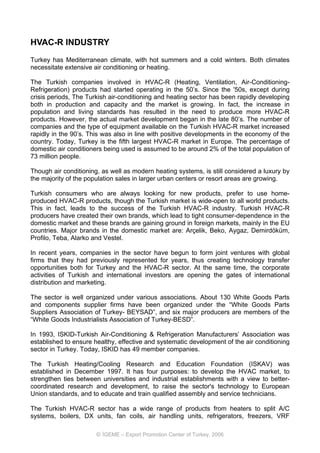 The document discusses Turkey's HVAC-R (heating, ventilation, air conditioning, and refrigeration) industry. It notes that Turkey has a Mediterranean climate requiring extensive air conditioning and heating. The Turkish HVAC-R industry began in the 1950s and has grown significantly since then to meet increasing demand. Today, Turkey has a large domestic HVAC-R market and is the fifth largest market in Europe. Major Turkish brands have been established and are also gaining ground in foreign markets, especially EU countries. Exports of Turkish HVAC-R products have increased substantially in recent years, with refrigerators and freezers being the largest export.