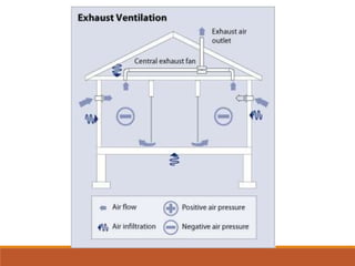 The document discusses heating, ventilation, and air conditioning (HVAC) systems. It describes the basic components and processes of heating, ventilation, and air conditioning. For heating, it discusses central heating systems using hot water or steam, and electric heating. For ventilation, it covers natural ventilation using windows and mechanical ventilation using fans. For air conditioning, it explains the basic operations of removing heat from indoor air and transferring it outside using a refrigerant in a compressor, condenser, evaporator coil, and blower. In summary, the document provides an overview of the key components, processes, and general effects of HVAC systems.