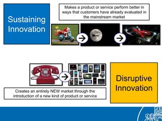 This document summarizes key concepts about disruptive innovation from Clayton Christensen's work. It defines disruptive innovation as creating a new market and value network that eventually disrupts existing markets. Disruptive innovations often have lower performance initially but eventually meet customer needs. Established companies struggle with disruptive innovation because their processes, values, and culture are optimized for sustaining innovations that appeal to existing customers. However, startups can more easily pursue disruptive innovations due to fewer resources but lower cost structures and ability to embrace new markets. The document provides strategies for large companies to develop capabilities for disruptive innovation through creating new internal teams, spinout organizations, or acquisitions.
