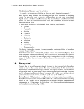 The document provides an overview of hazardous waste management, highlighting its significance as an environmental issue that has evolved since the 1960s. It covers definitions, regulatory initiatives, and the impact of hazardous waste on health and the environment, as well as current trends towards prevention and waste minimization. Additionally, it outlines the obligations of hazardous waste generators regarding identification, handling, and reporting, along with modern approaches to more sustainable practices.