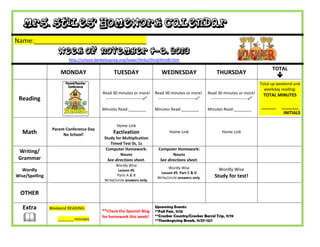 This document is a homework calendar for a student named for the week of November 4-8, 2013. It includes assignments for each day of the week in various subjects such as reading, math, writing, and Wordly Wise lessons. Students are expected to read for at least 30 minutes each weekday and record the number of minutes. There is also a parent conference day with no school on Wednesday and reminders of upcoming school events.
