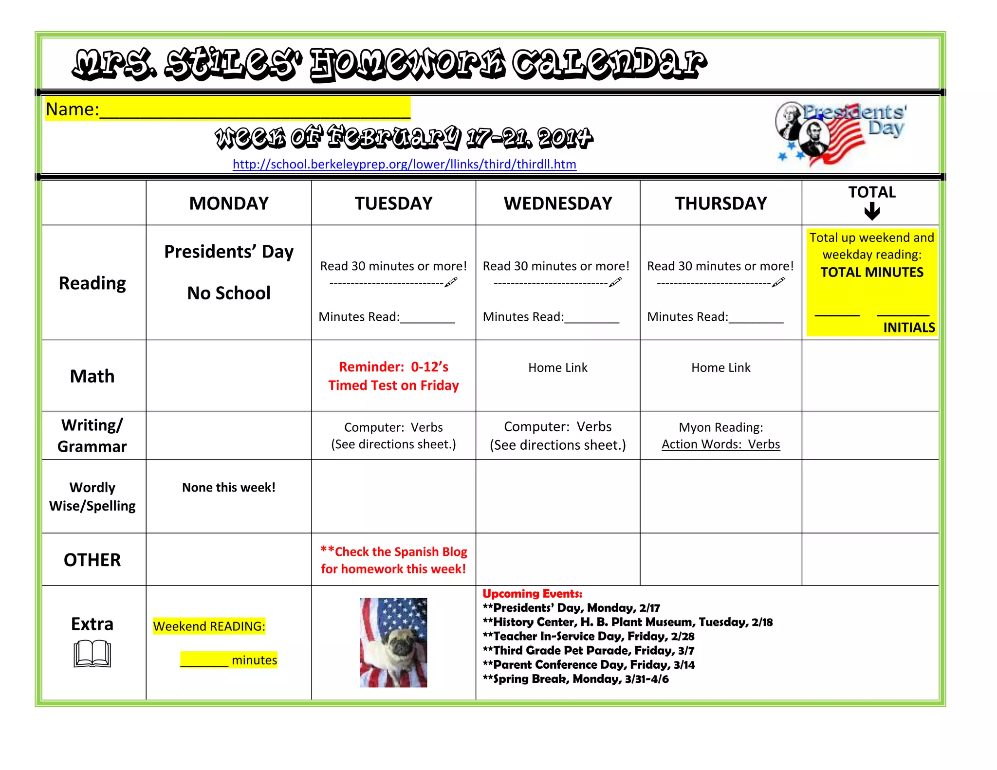 Mrs. Stiles' Homework Calendar provides assignments for the week of February 17-21, 2014. Students are assigned to read for at least 30 minutes each weekday and track their reading minutes. Math homework includes practicing time tables 0-12 for an upcoming timed test on Friday. Writing assignments focus on verbs, with computer activities and a Myon reading assignment related to action words. There is no Spanish or spelling homework this week. The calendar also lists upcoming school events through the month of March, including a Presidents' Day holiday, teacher in-service day, pet parade, parent conferences and spring break.
