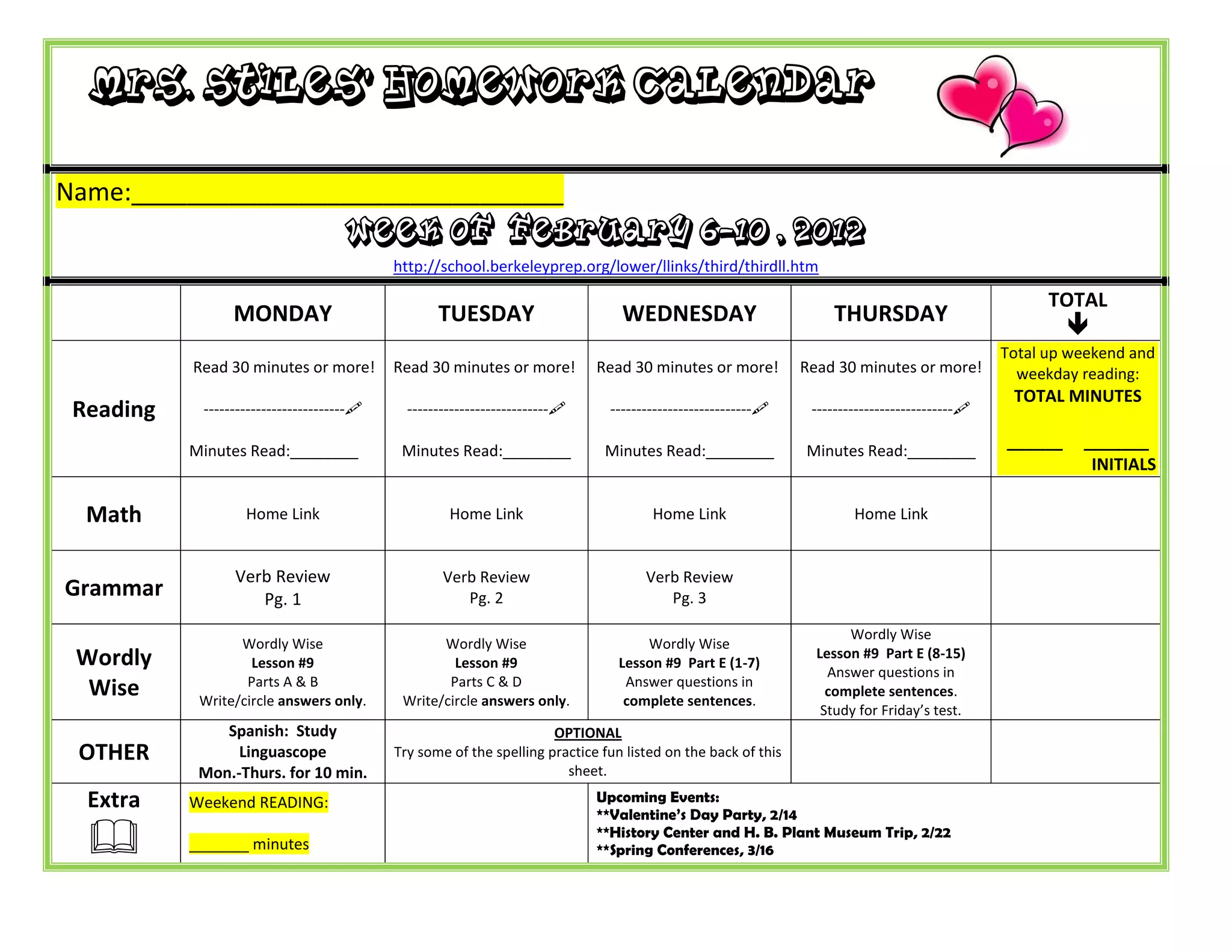 This document is Mrs. Stiles' homework calendar for a student for the week of February 6-10, 2012. It outlines the daily assignments for reading, math, grammar, wordly wise lessons, Spanish, and other subjects. It also notes upcoming events like a Valentine's Day party and a field trip to a history center and museum. Suggested word study activities are listed on the back for practicing the weekly spelling words.