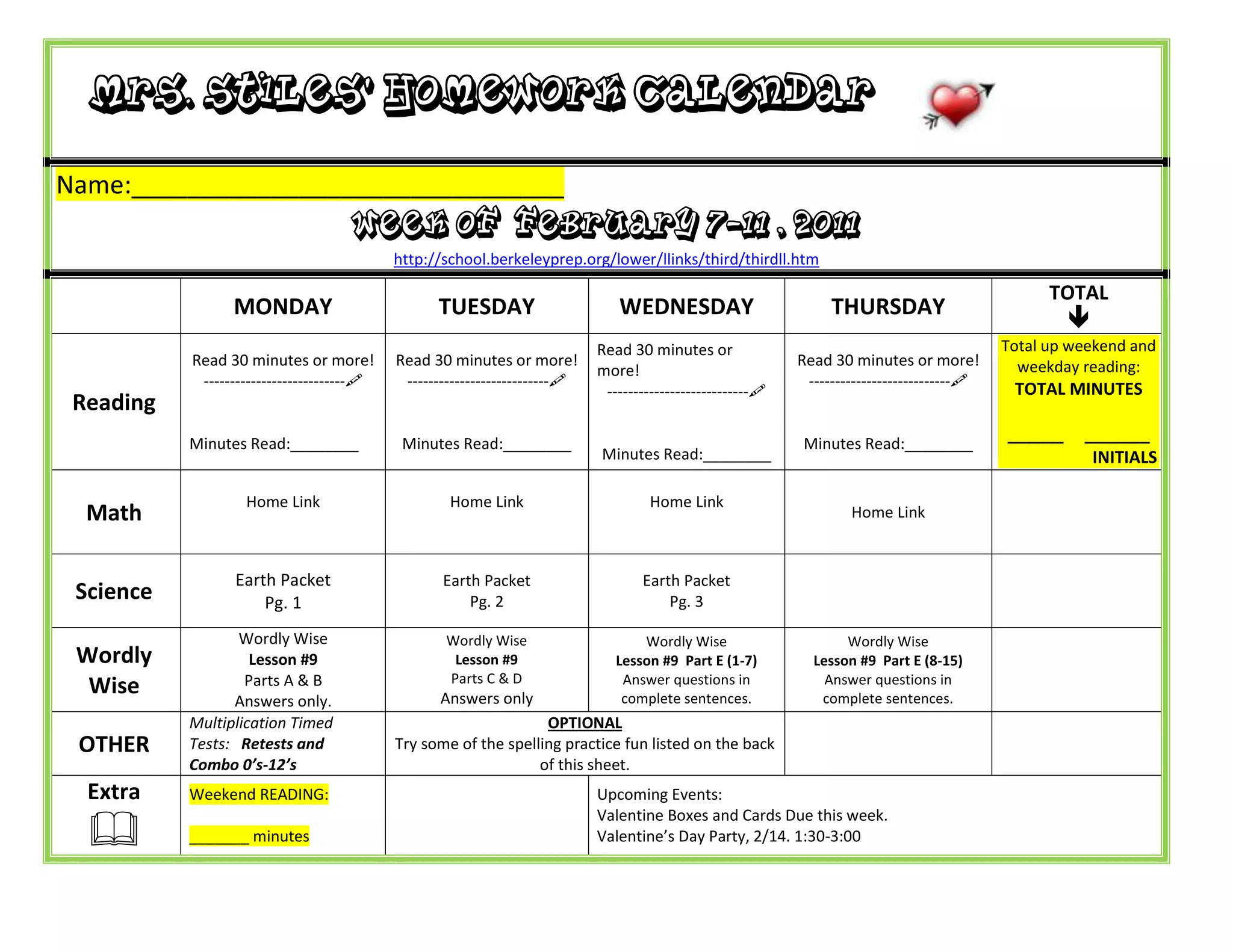 The document is Mrs. Stiles' homework calendar for a student for the week of February 7-11, 2011. It includes assignments for each day such as reading 30 minutes, completing math homework links, science packets, Wordly Wise lessons, and optional activities. It also includes a section for weekend reading and upcoming events such as Valentine's Day activities.