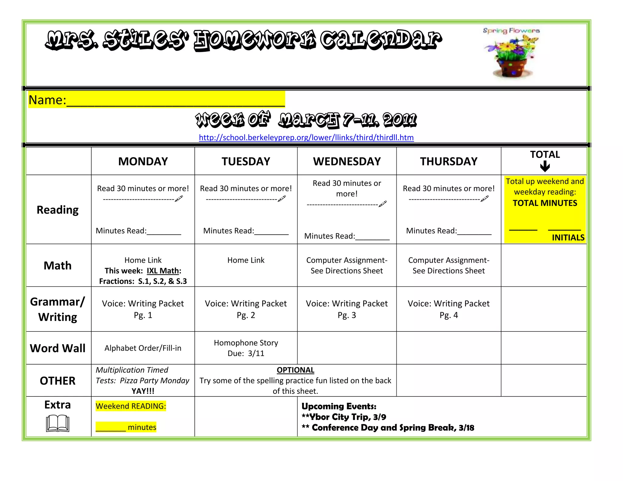 Mrs. Stiles' Homework Calendar assigns reading and homework tasks for the week of March 7-11, 2011. It includes:
