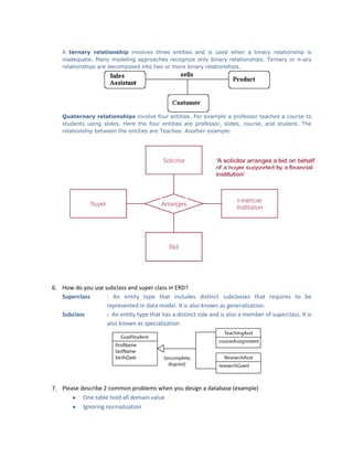 The document discusses database design concepts including the three phases of database design - conceptual, logical, and physical. It also discusses topics such as data modeling, normalization, transactions, and more. Key points include: - The conceptual phase constructs a model independent of physical considerations. The logical phase constructs a model based on a data model like relational but independent of specific DBMS. The physical phase produces a description of implementation on storage. - Normalization is a technique to minimize redundancy through functional dependencies and normalization forms like 1NF, 2NF, and 3NF. - Transactions ensure integrity through properties like atomicity, consistency, isolation, and durability (ACID).