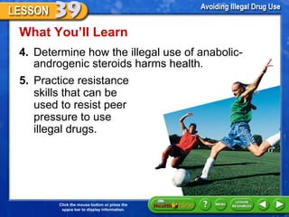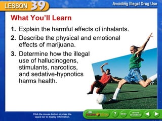 The document discusses the harmful effects of various illegal drugs, including inhalants, marijuana, hallucinogens, stimulants, narcotics, and steroid use. It describes how the illegal use of these substances can harm a person's physical health by damaging vital organs, increase risk of diseases and infections, and cause immediate death in some cases. It also discusses how illegal drug use can harm mental health by impairing judgment and decision making, increasing risk of accidents, violence and criminal behavior.