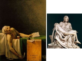 1) Jacques Louis-David's painting "Death of Marat" depicts the assassinated French revolutionary Jean-Paul Marat lying dead in his bath, alluding to Christian martyrdom.