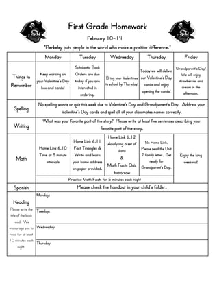 This homework assignment provides the schedule for the first grade class for the week of February 10-14. It includes preparing Valentine's Day cards and boxes to be delivered on Wednesday, as well as hosting Grandparent's Day on Friday with strawberries and cream. Students are asked to practice spelling and math facts each night, and complete various math homework assignments through Thursday in preparation for a math facts quiz on Friday.