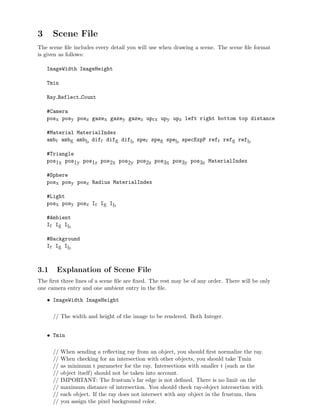 This document provides instructions for Assignment 1 of the CENG 477 Introduction to Computer Graphics course. Students are asked to implement a ray tracer that takes in a scene file as input and renders the scene using ray tracing techniques. The scene file format is defined, including specifications for the camera, materials, triangles, spheres, lights, ambient light and background color. Hints are provided about using object-oriented design with classes like Vector3, Camera, Ray, Shape, and Scene. Students should submit a single zip file called "hw1.zip" containing their C++ code and makefile.