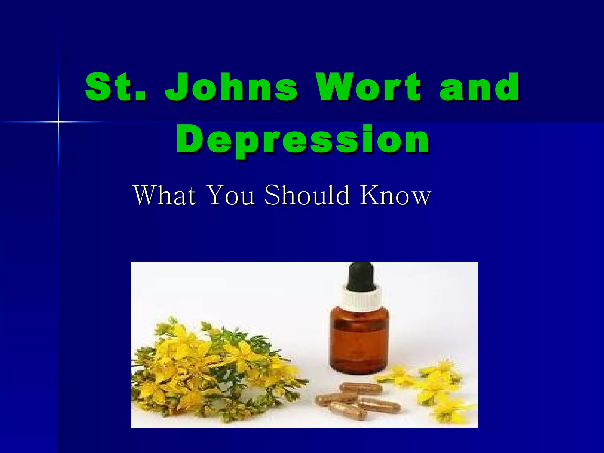 The document discusses St. John's Wort, an herbal supplement, as an alternative treatment for depression. It outlines the signs and symptoms of minor and major depression, compares St. John's Wort to prescription antidepressants, and reviews the clinical evidence that St. John's Wort is as effective as antidepressants with fewer side effects. The document provides recommendations on choosing a supplement and lists resources for additional information.