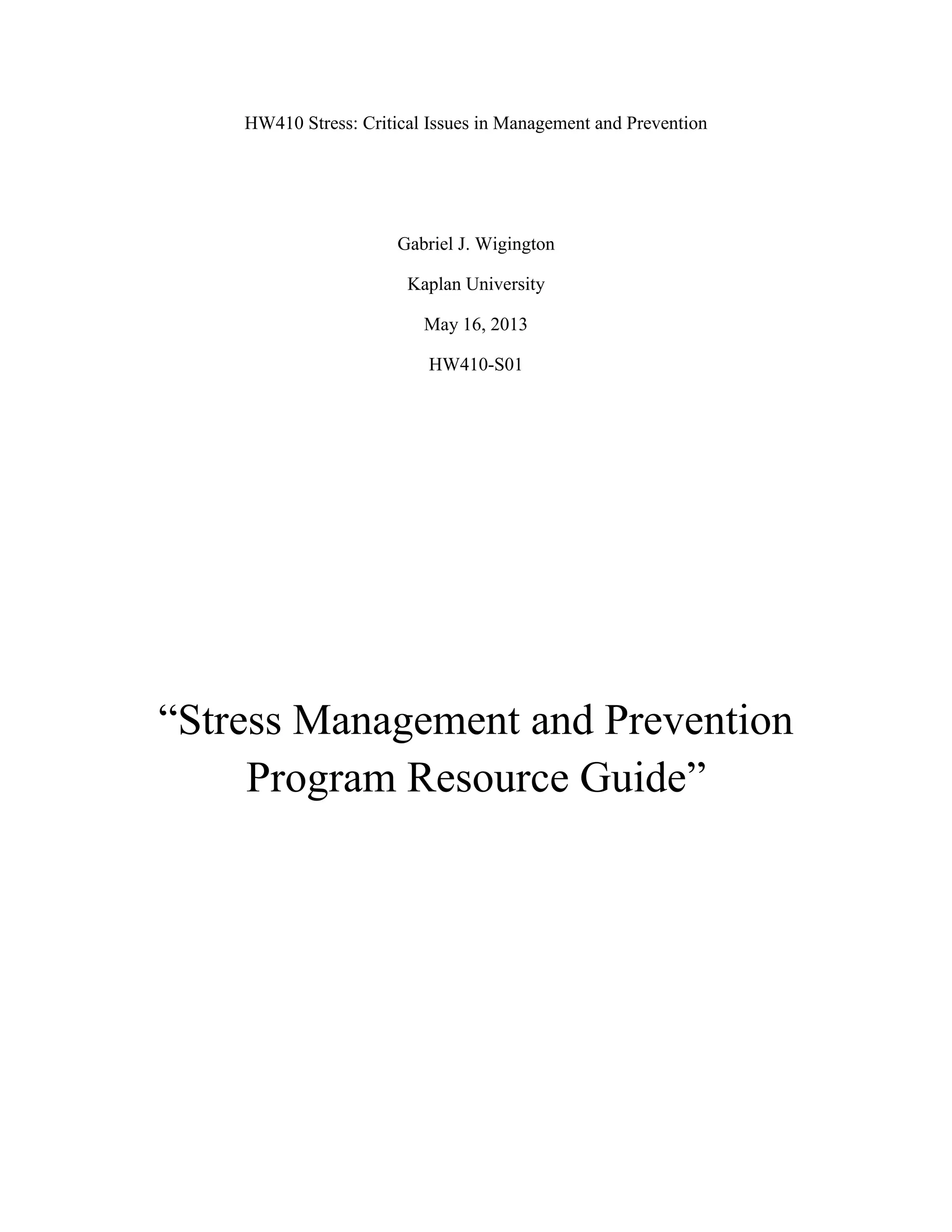 This document outlines the contents of a stress management and prevention resource guide containing 9 units. The units cover topics like the nature and physiology of stress, the psychology of stress, personality traits, and strategies for coping with stress. Key learning points describe how stress is the body's response to threats and affects people physically and mentally. Chronic stress can result from unresolved anger or depression and lead to illness. While stressors come in many forms, social support and developing a positive mindset can help with coping. The document provides exercises, tools, and journal writing prompts for each unit to help learn about and manage stress.
