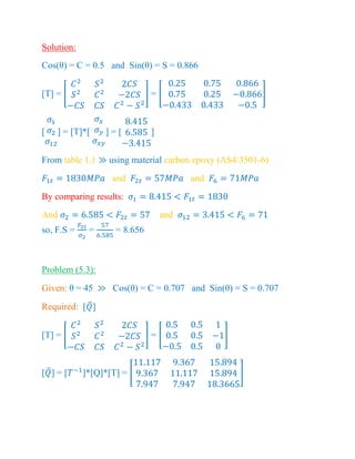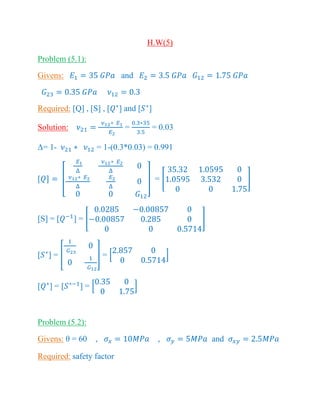 This document contains solutions to 4 problems from H.W(5). Problem 5.1 calculates fiber volume fraction and fiber orientation tensors. Problem 5.2 calculates the safety factor of a composite material with given fiber orientation. Problem 5.3 calculates average stress in a composite with 45 degree fiber orientation. Problem 5.4 calculates average stress in a composite with 90 degree fiber orientation.
