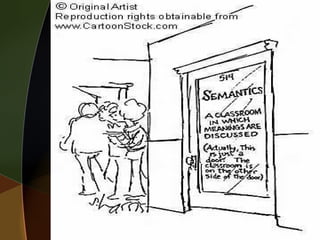 This document provides an introduction to semantics, the study of meaning in language. It defines semantics as studying the meaning of morphemes, words, phrases and sentences. Meaning arises from the systematic link between linguistic forms and things in the world. It also discusses different aspects of meaning, including reference versus sense, denotation versus sense, and literal versus non-literal meaning. Sense is how the speaker thinks about an object, while reference is the actual object being referred to.