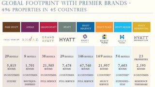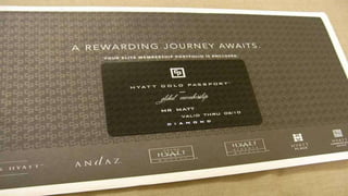 The document provides an overview of the Hyatt Gold Passport loyalty program. It describes the various membership tiers (Gold, Platinum, Diamond) and corresponding benefits such as point bonuses, room upgrades, and lounge access. Key benefits highlighted include earning 5 points per dollar spent, redeeming points for free nights starting at 5,000 points, and upgrading membership through qualifying stays. The program is positioned as competitive due to generous rewards, global hotel network, and ease of accumulating and redeeming points for travel experiences.