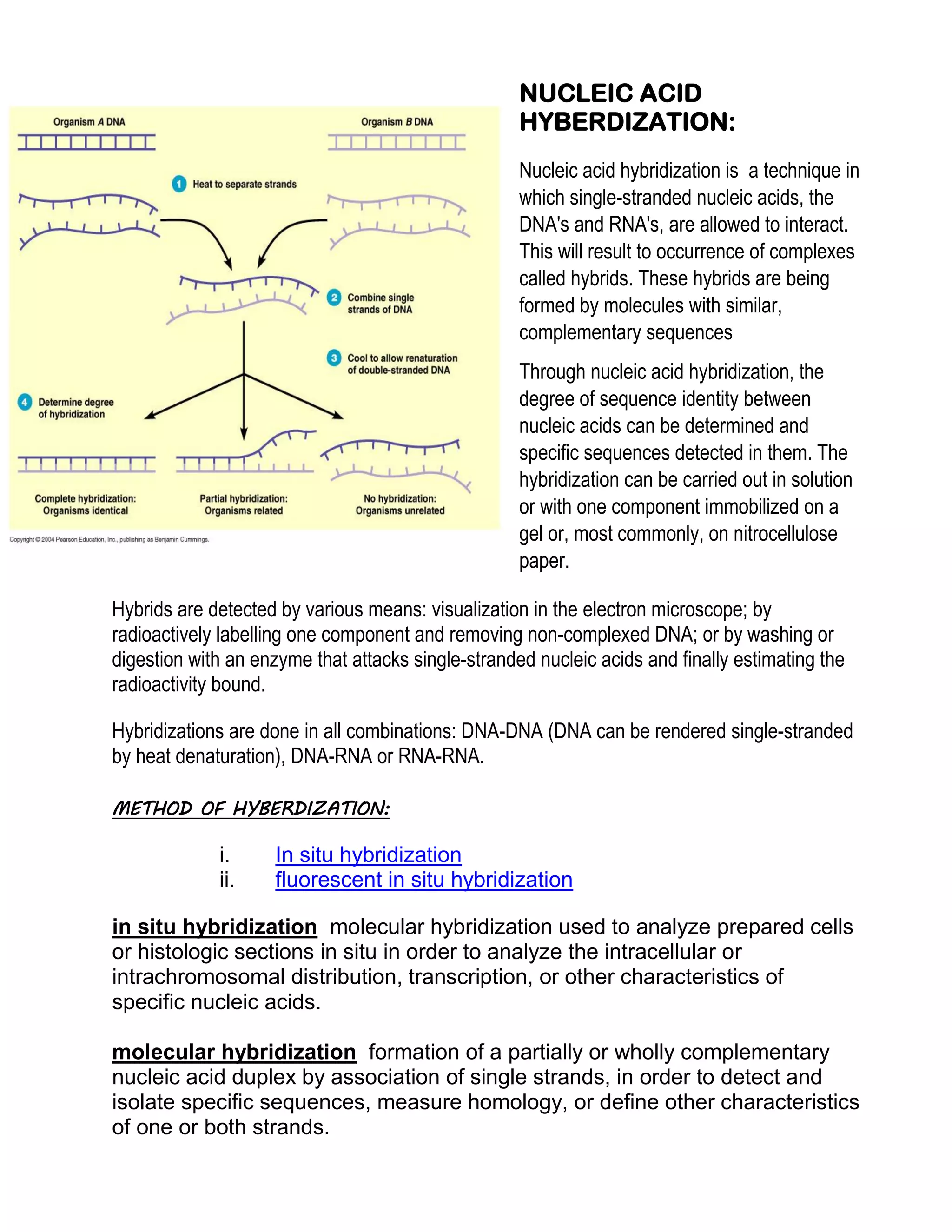 Nucleic acid hybridization is a technique to detect specific nucleic acid sequences. It involves allowing single-stranded DNA or RNA molecules to interact and form hybrids based on complementary base pairing. This allows researchers to determine the degree of sequence identity between nucleic acids and detect specific sequences. Fluorescent in situ hybridization (FISH) is a type of hybridization that uses fluorescent probes to map DNA sequences onto chromosomes. FISH has applications in cytogenetics, cancer detection, and prenatal diagnosis of genetic disorders.