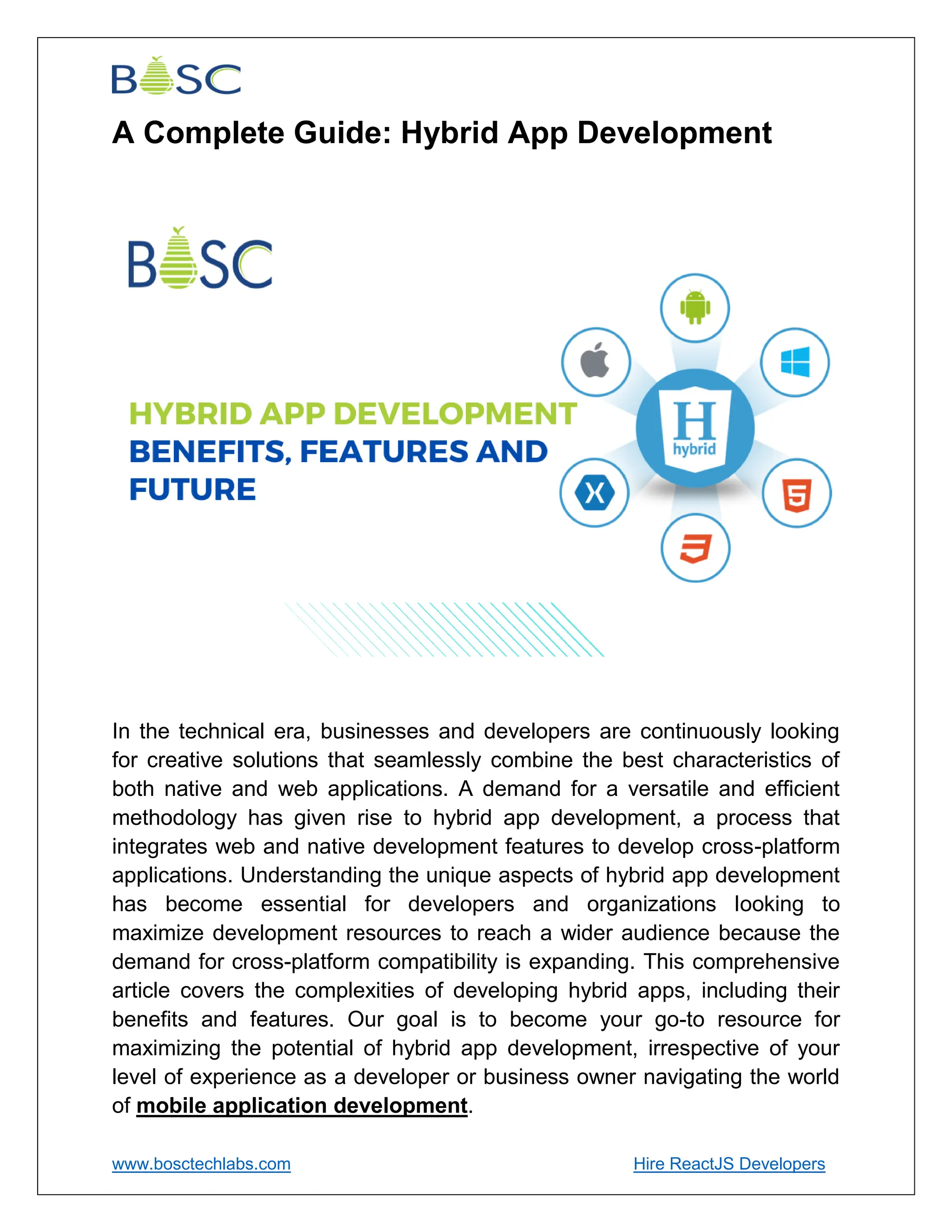 The document provides a comprehensive overview of hybrid app development, highlighting its advantages such as cost-effectiveness, faster development cycles, and the ability to access native device features. It discusses key frameworks like React Native, Flutter, and Ionic that simplify the development process using a single codebase for multiple platforms. The future of hybrid app development appears promising, with ongoing technological advancements and an expanding ecosystem catering to diverse business needs.