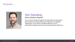 The document discusses hybrid development in regulated environments, outlining a flexible approach combining structured methodologies like waterfall and agile. It emphasizes the importance of speed, accountability, and traceability, while providing best practice recommendations. Additionally, it highlights the need for efficient workflow management and communication among teams to enhance operational efficiency.