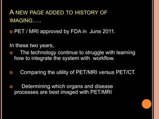 PET-MRI is a hybrid imaging technique that was approved by the FDA in 2011. It provides both the anatomical details from MRI and the functional and metabolic information from PET. There are two main types of PET-MRI scanners: simultaneous and sequential. Implementation of PET-MRI presents challenges related to PET detector elements, attenuation correction, and system corrections. PET-MRI shows potential for use in neurology, oncology, pediatrics, cardiology, and musculoskeletal imaging by providing more biological and functional data than PET-CT without radiation exposure. Examples of clinical applications include detecting tumor recurrence, evaluating treatment response, and replacing painful bone marrow biopsies for lymphoma.