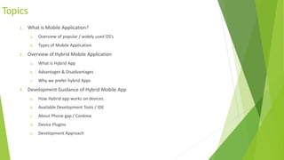 The document provides an extensive overview of hybrid mobile applications, including definitions, types of mobile apps (native, web, and hybrid), and their respective advantages and disadvantages. It outlines development guidance for hybrid apps, including coding guidelines, development tools, and deployment procedures for both Android and iOS platforms. Additionally, it discusses the Apache Cordova framework as a primary tool for hybrid app development and the importance of optimizing apps for various platforms.