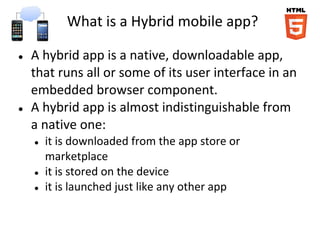 This document discusses hybrid mobile apps, which are native apps that use an embedded browser to run some or all of their user interface. Hybrid apps combine the advantages of native apps like being downloaded from app stores with the advantages of web apps like being able to write code once and deploy to multiple platforms. Frameworks exist that allow hybrid apps to access native device capabilities like the camera from JavaScript. The document argues that with frameworks, hybrid apps can provide rich experiences comparable to native apps.