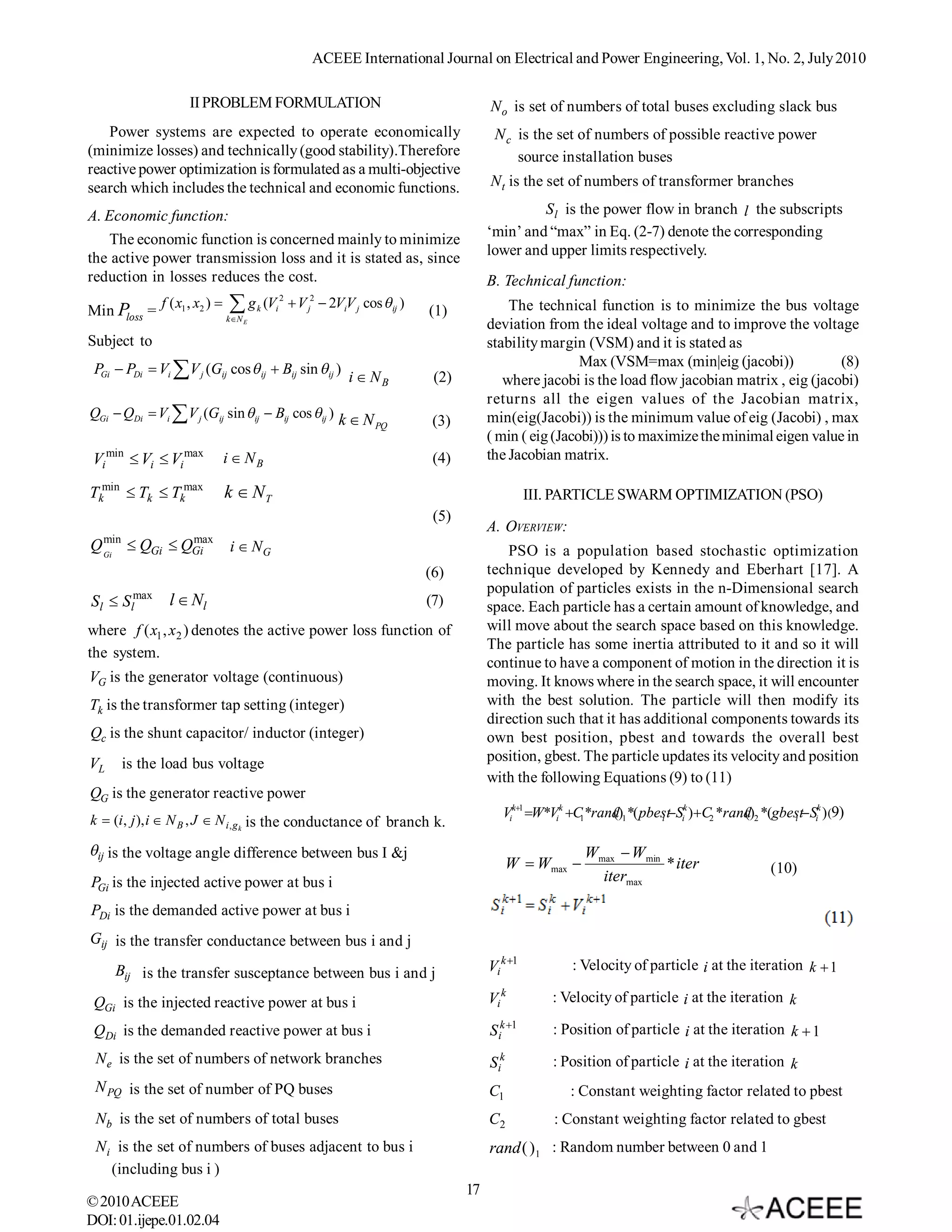This paper proposes a hybrid particle swarm optimization (HPSO) method to solve the multi-objective reactive power dispatch problem of minimizing transmission losses and maximizing voltage stability. The HPSO method expands on PSO and genetic algorithms to handle mixed integer and nonlinear optimization problems with both continuous and discrete control variables. The method is evaluated on the IEEE 30-bus and 57-bus test systems. Results show the HPSO approach improves voltage stability compared to conventional, genetic algorithm, and particle swarm optimization methods.