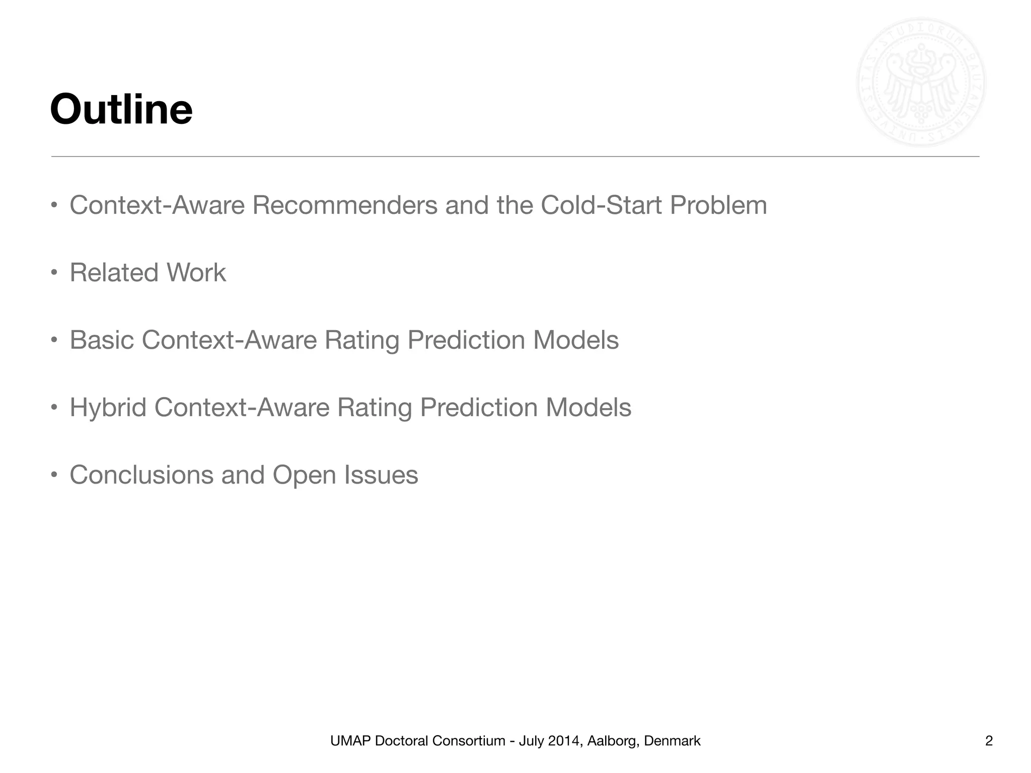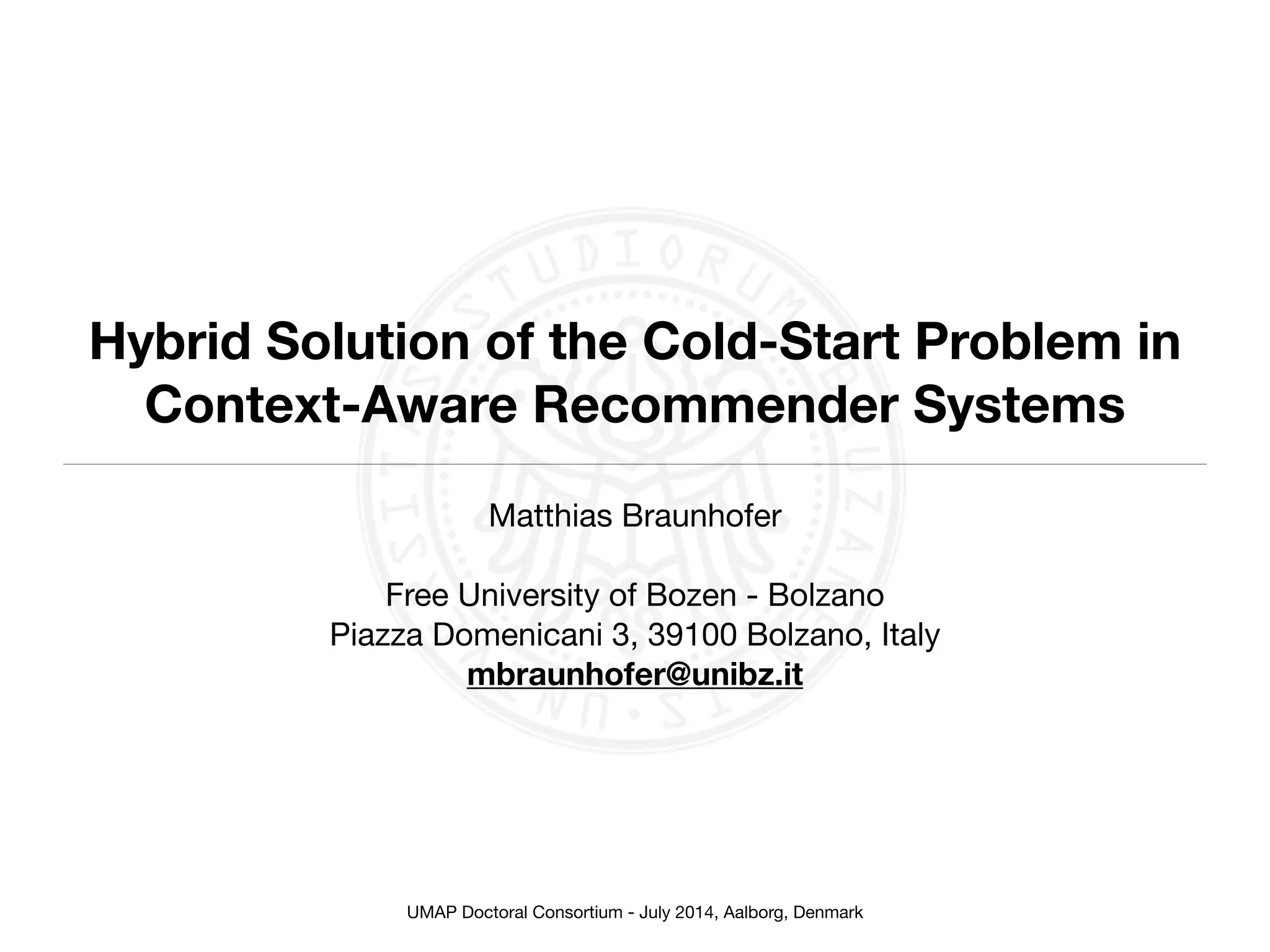 This document summarizes Matthias Braunhofer's doctoral research on addressing the cold-start problem in context-aware recommender systems. It presents basic context-aware rating prediction models like CAMF-CC and SPF, and proposes novel variants that incorporate additional contextual information like item categories or user demographics. It also describes two approaches to building hybrid context-aware recommender systems - heuristic switching and adaptive weighting. An evaluation compares the performance of these models on three datasets in addressing new user, new item, and new context cold-start situations, finding that hybrid models generally outperform basic models.
