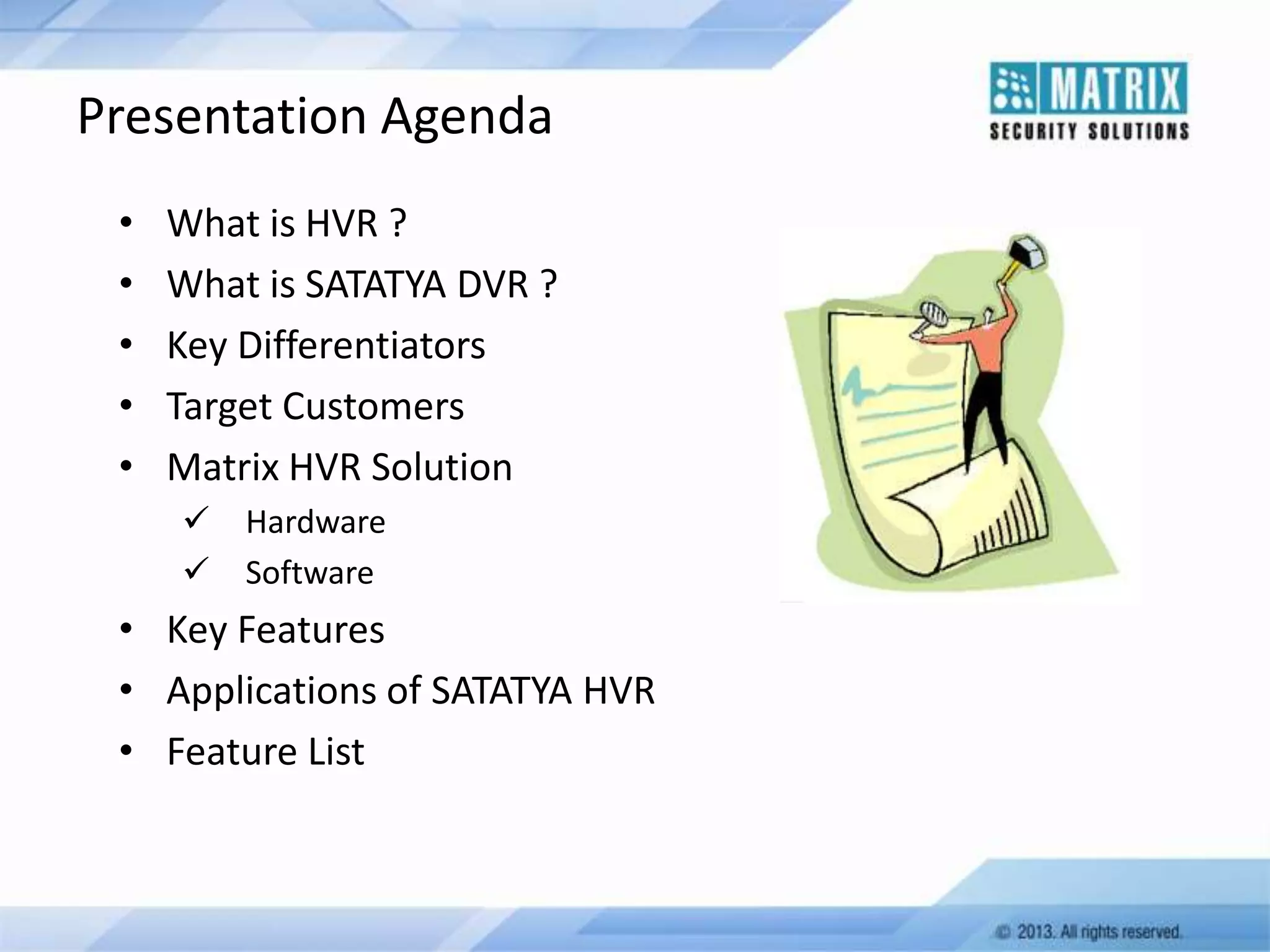 The document details the functionalities and specifications of the Satatya HVR, a versatile surveillance solution that integrates both analog and IP cameras for efficient security management. It outlines key features, technical specifications, applications for various customer segments such as enterprises and hotels, along with centralized management software options for remote monitoring. The Satatya HVR aims to provide enhanced security, scalability, and cost-effectiveness in diverse environments.