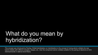 This concept was introduced by Pauling. Orbital hybridization (or hybridization) is the concept of mixing atomic orbitals into new