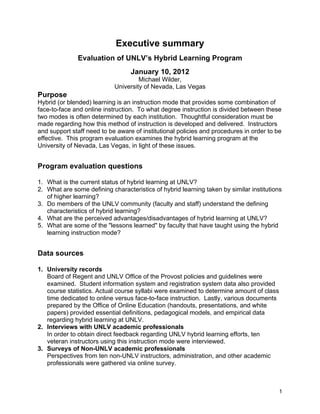 The document provides an evaluation of UNLV's hybrid learning program between 2010-2012. It finds that the number of hybrid courses offered annually at UNLV has been increasing, with 100 hybrid courses offered during that period. The majority of instructors teaching hybrid courses had misconceptions about what constitutes a hybrid course. Most instructors also felt they lacked adequate training to teach hybrid courses. The evaluation recommends establishing clear definitions for different instruction modes, creating procedures for high-quality course development, and providing training for instructors on best practices for hybrid learning.