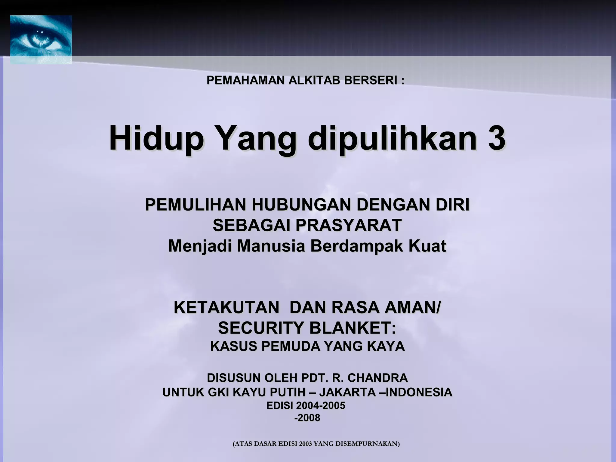 Dokumen tersebut membahas tentang seorang pemuda kaya yang bertanya kepada Yesus mengenai apa yang harus dilakukan untuk mendapatkan kehidupan abadi. Ketika Yesus menyuruhnya menjual semua miliknya dan mengikut Dia, pemuda itu pulang kecewa karena tidak mau melepaskan harta bendanya yang menjadi sumber rasa aman atau 'security blanket'-nya. Dokumen ini menganalisis bahwa masalahnya bukan soal uang,
