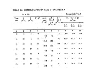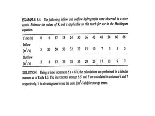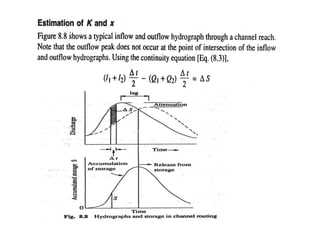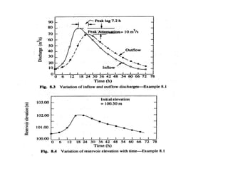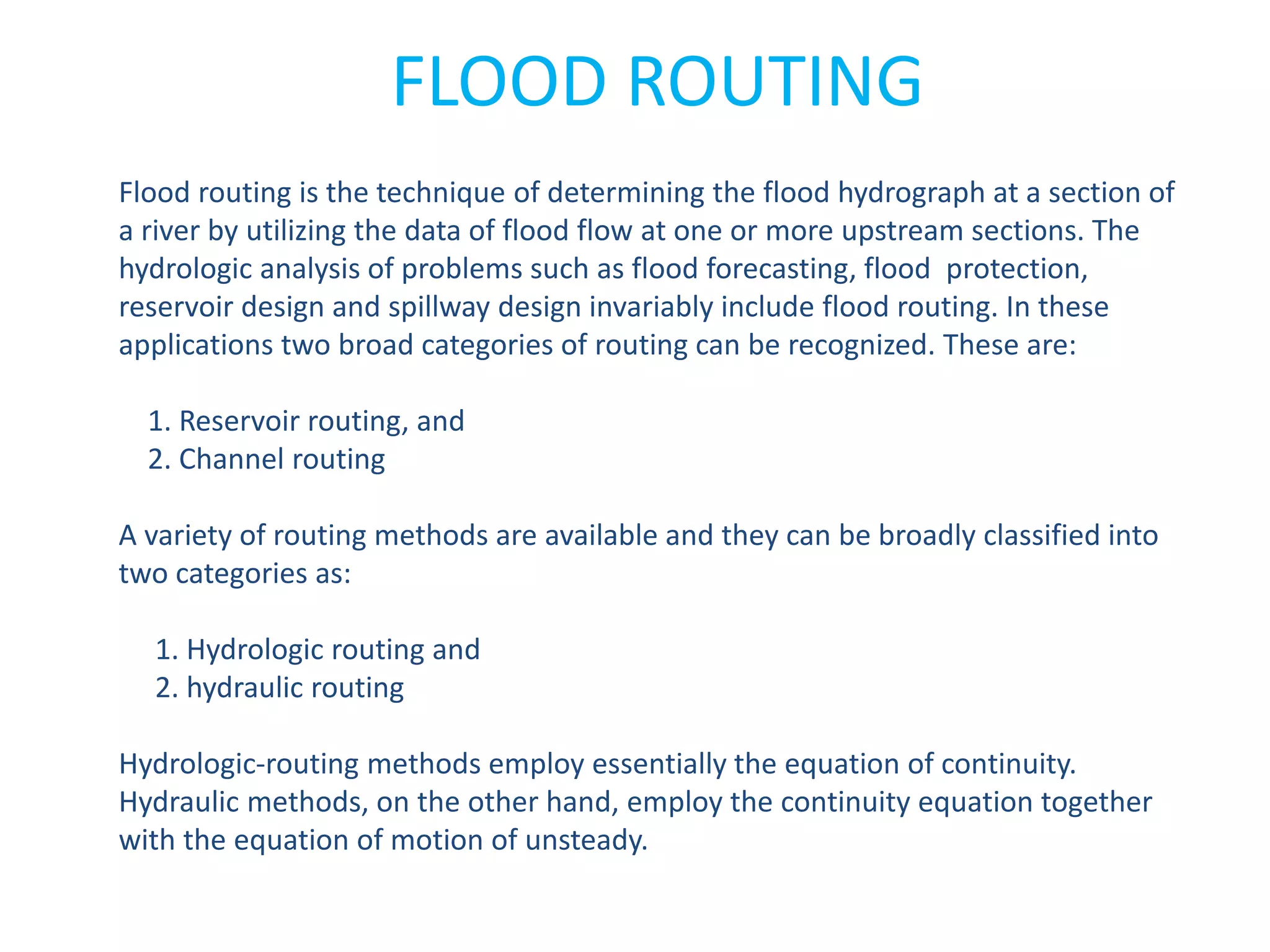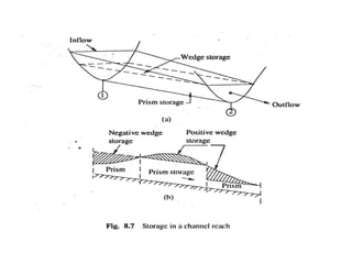 This document discusses flood routing techniques used to determine flood levels at different points along a river. There are two main categories of routing: reservoir routing which analyzes flood levels upstream of reservoirs, and channel routing which analyzes flood levels along river channels. Hydrologic routing methods use continuity equations while hydraulic methods also use equations of motion. Storage routing in reservoirs assumes a horizontal water surface and routes floods through calculating changes in storage over time intervals. Channel routing considers storage as a function of both inflow and outflow, accounting for storage in the channel prism and as a wedge.
