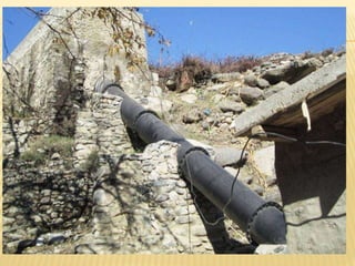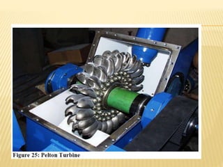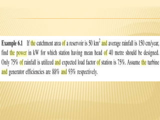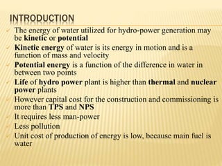 The document discusses hydroelectric power plants. It describes how hydroelectric power utilizes the potential and kinetic energy of water using components like dams, reservoirs, penstocks and turbines. It classifies hydroelectric plants based on available water quantity, head, and load served. Run-of-river and reservoir plants are described. Common turbine types like Francis, Kaplan and Pelton are mentioned for different heads. The document outlines the various components of hydroelectric plants including intake gates, penstocks, draft tubes and switchyards. Advantages like no emissions and lower operating costs are contrasted with disadvantages of location dependence and environmental impacts.